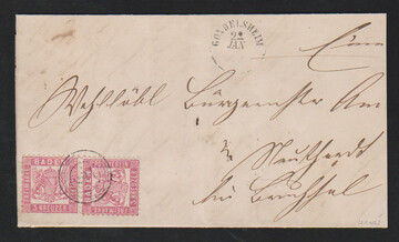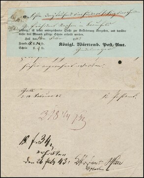 "Wetzlar", 1843, einmal K2, zwei seltene "Franko-Zettel" aus dem württembergischen Hall mit innen aufgeklebten Postquittungen zurück nach Braunfels