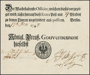 "Berlin", 1748, Extrapost-Passierschein für vier Pferde, "königl. Preuß. Gouvernement hieselbst", ein Unikat aus dieser Zeit, ex Metzer, ex Kruschel, sign. Kruschel (26. Kruschel 1987), ex Slg. Erivan Haub