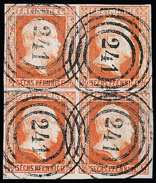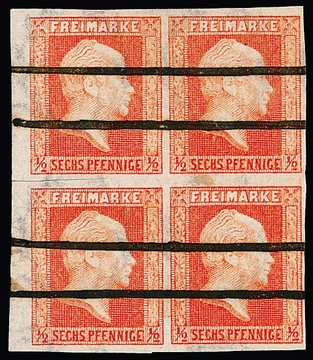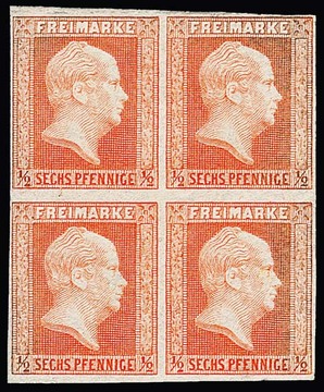 1/2 Sgr. ziegelrot, erster Neudruck von 1864 im ungebrauchten Viererblock (leichte "Oxidationsspuren"), als Original (!) sign. Krause, ferner sign. Bühler, ex Slg. Erivan Haub