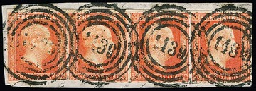 1/2 Sgr. ziegelrot, seltener Viererstreifen auf Briefstück mit NS "1439" (Stettin). Die beiden linken Marken unten etwas angeschnitten, sonst gut. Mi. 1000,-