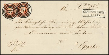 Einmalig schönes Briefpaar aus gleicher Korrespondenz von Creuzburg nach Oppeln: 1/2 Sgr. ziegelrot jeweils im Paar (einmal ein Wert Rand verbreitert, einmal Kabinett vom linken Bogenrand) auf zwei Briefen mit klaren NS "277" und Neben-Ra2 "Creutzburg O/S" nach Oppeln, beide ex Metzer, je Atteste Jäschke-L., ex Slg. Erivan Haub