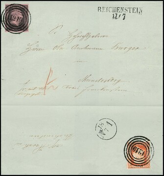 1/2 Sgr. ziegelrot als Bestellgeld rückseitig, vorderseitig 1 Sgr. schw./rosa als Porto (rechter Rand verbreitert), auf schön gestempeltem Brief (rs. fehlt ein Klappenteil) mit NS "1219" und Neben-L2 "Reichenstein" nach Münsterberg. Ex Metzer, ex Kuphal, sign. Kruschel und Attest Jäschke-L., ex Slg. Erivan Haub