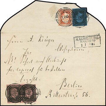 1/2 Sgr. ziegelrot und 2 Sgr. schw./blau, perfekte Exemplare als Expreßgebühr rückseitig, vorderseitig Paar 1 Sgr. schw./rosa als Doppelporto, auf Pracht-Expreßcouvert mit NS "907" und Ra3 "Magdeburg Bahnhof" nach Berlin, sign. Meier, ex Slg. Erivan Haub