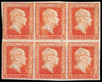 1/2 Sgr. ziegelrot, noch voll- bis breitrandig geschnittener, waagerechter Sechserblock mit vollständigem Originalgummi (im Zwischenraum waager. vorgefaltet, die Marken nicht berührend). Eine seltene Einheit, wobei im Michel-Spezialkatalog noch nicht einmal ein waager. Viererstreifen bzw. Viererblock mit Preisnotierung aufgeführt ist, sign. Kastaun, Fotoattest Jäschke-L.