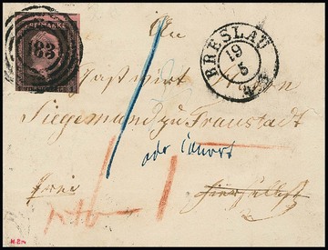 1 Sgr. schw./feuerrot, angeschnittenes Exemplar einzeln auf interessantem Brief, erst als Ortsbrief mit NS "183" und K2 "Breslau" (Ankunftsstempel vom gleichen Tag) an einen Reisenden aus Fraustadt, dann mit Bartaxe "1" weitergesandt, sign. Brettl, Banker. Mi. 1800,-