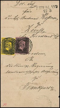 1 Sgr. rosa und 3 Sgr. schw./dunkelgelb, Kabinettstücke auf Vorderseite von Post-Ins.-Doc. mit NS "444" und Neben-L2 "Friedland" 1855, ex Slg. Erivan Haub
