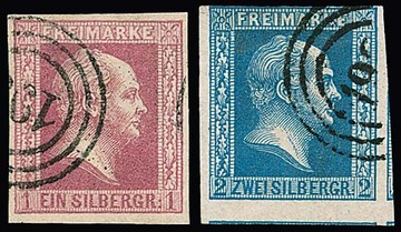 1 Sgr. karminrosa und 2 Sgr. blau (oben noch vollrandig, min. hell) je mit seltener Entwertung durch den dänischen Schiffspost-NS "198" der Route Stettin-Kopenhagen
