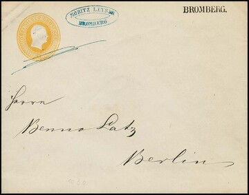 Zwei Kopf-Ganzsachen 3 Sgr. orange im guten Großformat aus gleicher Korrespondenz von Bromberg (auch je vs. gleicher Absenderstempel) je nach Berlin. Einmal nur mit Bahnpost-L1 "Bromberg", das andere Couvert mit Zusatzfrankatur 3 Sgr. schw./gelb, NS "191" und Ra2 als Doppelbrief, sign. Banker