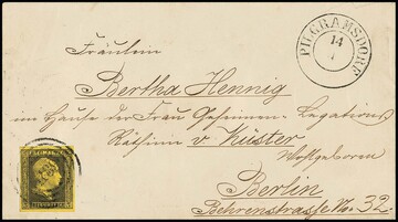 3 Sgr. schw./gelb, breitrandiges Prachtstück vom rechten Bogenrand (unbed. Reinigungsspuren) mit Orts-K2 "Coeln" klar, Fotoexp. Jäschke-L., ex Slg. Erivan Haub