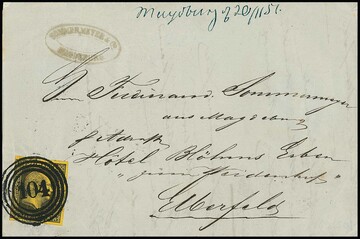 3 Sgr. schw./dunkelgelb, perfektes Exemplar auf Brief (ohne Seitenklappen) mit gutem Berliner Bahnpost-NS "104" in der Type mit großen Ziffern sowie handschriftlicher Aufgabe "Magdeburg d. 20/11 51", ex Slg. Erivan Haub