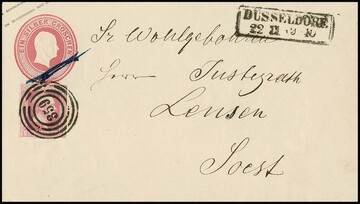 1 Sgr. rosa, Prachtstück auf Ganzsache 1 Sgr. rosa (rs. fehlt die obere Viertelklappe), mit NS "359" und Ra2 "Düsseldorf" nach Soest, ex Slg. Erivan Haub
