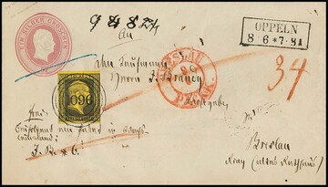 3 Sgr. schw./dunkelgelb, Luxusstück mit ideal zentrischem NS "1096" (Stahltype) und Rötelstrich auf Ganzsache 1 Sgr. rosa (winziger Randriß), mit Ra2 "Oppeln" als Paketbrief nach Breslau, ex Slg. Erivan Haub