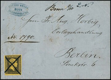 3 Sgr. schw./dunkelgelb, Kabinettstück mit Federkreuz-Entwertung und hs. Bahnpost-Aufgabevermerk "Bonn 3/10" (1857) auf Brief nach Berlin