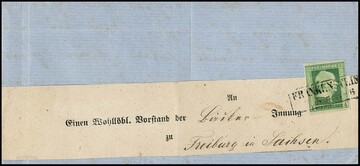 4 Pfg. grün, Luxusstück mit klarem Ra2 "Frankenstein" auf kpl. blauer Drucksache mit weißem Streifband nach Freiburg, sign. Krause, Banker