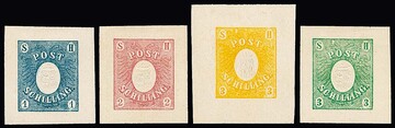 1 Sch. blau und 2 Sch. rosa, je Rosenkranz` sche Einzelabzüge vom Urstempel in kombiniertem Buch-/Prägedruck, sowie zwei Rosenkranz` sche Drucke 3 Sch. grün und zitronengelb