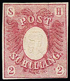 1 1/3 Sch. rosalila, seltener waagerechter Viererstreifen mit K2 "Eckernförde", die beiden linken Marken leichte vs. Tintenspuren (etwas abgenutzt), Fotoexp. Möller. Mi. "-.-"