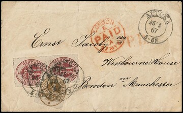 1 1/3 Sch. rotkarmin im senkrechten Paar, nebst 4 Sch. braunocker, als seltene 6 2/3 Sch.- bzw. 5 Sgr.-Frankatur auf Brief nach England, K2 "Altona 25/5 67", Umschlag stärkere Beförderungsspuren. Interessanter und seltener Auslandsbrief