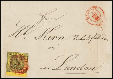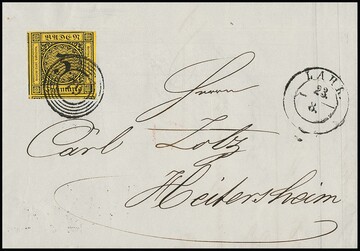 3 Kr. schw./dunkelgelb, riesenrandiges Luxusstück (drei Seiten Nebenmarken) auf Nachnahme-Faltbriefchen mit NS "63" und Neben-L2 "Hüfingen" 1852. Brief wie üblich ohne Seitenklappen, ex Slg. Erivan Haub