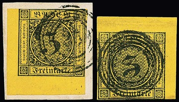 3 Kr. schw./gelb, zwei Prachtstücke auf (seitlich nicht ganz komplettem) gef. Brief mit je roten NS "115" und K2 "Rastatt", sign. Seeger