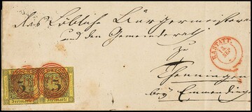 3 Kr. schw./dunkelgelb vom linken Rand auf Luxusbriefstück mit idealem NS "51" (Graben) in rot vorzüglich klar. Einer der schönsten bekannten Abschläge dieser großen Stempel-Rarität, dopp. sign. Englert, Unverferth