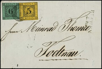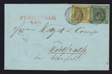 3 Kr. schw./gelb (oben angeschnitten) und 6 Kr. schw./gelbgrün, meist vollrandig, auf Postvereinsbrief von Pforzheim (roter Neben-L2) nach Wülfrath