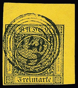 3 Kr. schw./gelb, größere rechte obere Kabinett-Bogenecke mit zentrischem und klarem NS "148" (Villingen), ex Slg. de Cock