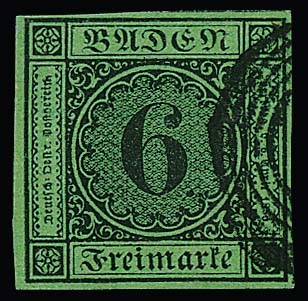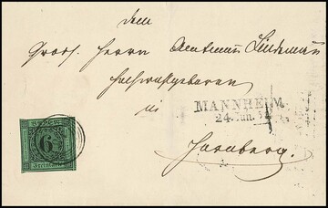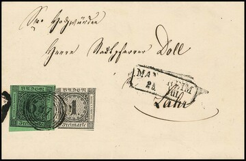 6 Kr. schw./gelbgrün vom Unterrand in Mischfrankatur mit 1 Kr. schwarz, teils Schnittfehler, auf ursprünglichem Faltbrief von Mannheim nach Lahr, seltene Kombination, in der Slg. Koch war nur ein Briefstück enthalten mit Verweis auf nur noch einen weiteren existierenden Brief mit dieser Mischfrankatur