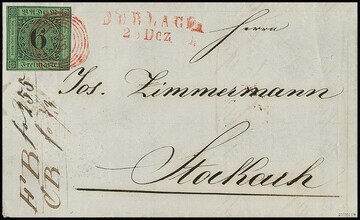 6 Kr. schw./gelbgrün, gut gerandetes Kabinettstück auf Brief mit je rotem NS "28" und Neben-L2 "Durlach", sign. Seeger, ex Slg. Erivan Haub