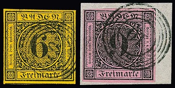 9 Kr. schw./altrosa, überrandig, belangloser kleiner Randspalt links, auf Brief von Freiburg 1852 nach Wurzach, Mi. 600,-, Fotoexp. Stegmüller. Dazu Brief aus gleicher Korrespondenz mit üblich geschnittener 9 Kr. schw./dunkelrosa, späte Auflage aus 1859, sign. Stegmüller