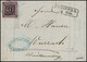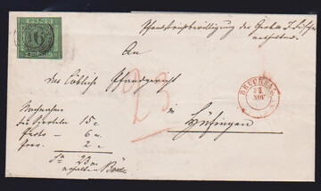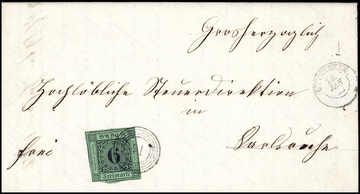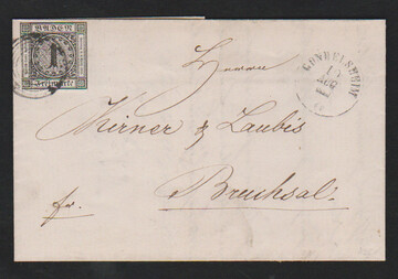 6 Kr. schw./gelbgrün, dreiseitig breitrandig, auf Nachnahmebrief aus Bruchsal (roter Neben-K2), innen doppelt verwendet mit württembergischem Bahnpost-HK "Maulbronn"