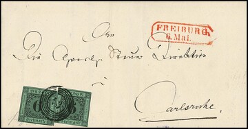 6 Kr. schw./blaugrün, zwei meist vollrandige Exemplare auf frischem Brief von Freiburg (roter Neben-Ra2) 1852 nach Carlsruhe, sign. Pfenninger