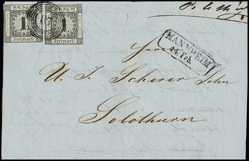 1 Kr. schwarz per zwei, linke vollrandig, rechte typisch geschnitten, auf Auslands-Drucksache 1856 von Mannheim nach Solothurn/Schweiz