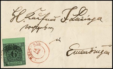 6 Kr. schw./blaugrün, überrandiges Kabinettstück, drei Seiten Nebenmarken, auf Brief aus Mannheim, Brief in den Kanten etwas angetrennt bzw. kl. Einriß