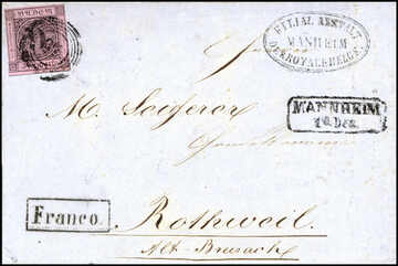 9 Kr. schw./rosa einzeln auf Brief mit NS "87" und Ra2 "Mannheim" nach Rothweil/Alt-Breisach mit Neben-Ra1 "Franco". Trotz kl. Mängel ein ungewöhnlicher, innerbadischer Brief mit Franko-Stempel