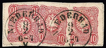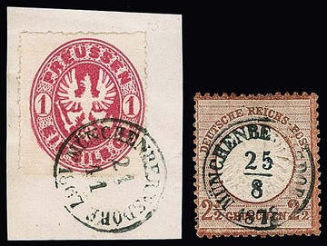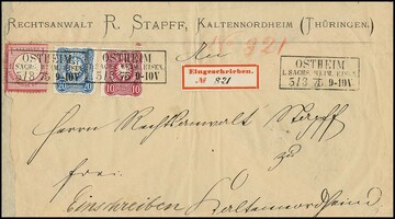 "Ostheim i. Sachs. Weim. Eisen.", neuer Ra3 vom 5.3.75 klar auf seitlich geöffnetem Einschreibebrief (kl. Mgl.) mit seltener wertgleicher Währungs-Mischfrankatur 1 Gr. rosa und 10 Pfge., sowie 20 Pfge., ferner auf früh verwendeter Ganzsache 10 Pfg. 1877