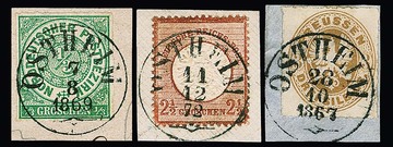 "Ostheim", nachverw. K1 je sehr schön klar zentrisch auf vier teils Luxusbriefstücken, Preußen 3 Sgr., NDP 1/3 und 1 Gr., sowie 2 1/2 Gr. Brustschild (Fotoexp. Sommer)