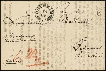 "Ostheim", 1840, je K1 vom 23. Mai auf zwei Drucksachen, Bittbriefe der Sondheimer Abgebrannten nach Rodach bzw. Oederan, je mit der Bitte um Hilfe nach dem Brand v. 4. Mai 1840