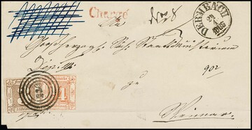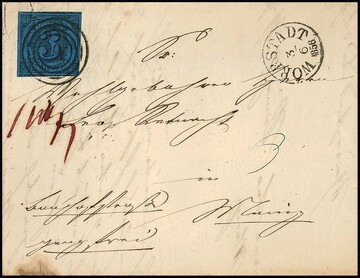 3 Kr. schw./dunkelblau, hervorragend riesenrandiges Kabinettstück mit Nebenmarken (eine kleine Eckknitterung liesse sich ausbügeln und wäre kein Mangel) auf Faltbrief (unten links kl. Fleck) mit besserem NS "164" und K1 "Wörrstadt", ex Slg. Erivan Haub