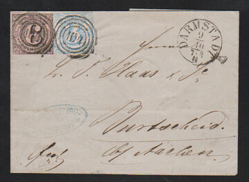 6 Kr. schw./rosa in Mischfrankatur mit Ausgabe 1860, 3 Kr. hellblau, weitgehend vollrandig, mit NS "104" und K1 "Darmstadt" auf Faltbrief nach Preußen