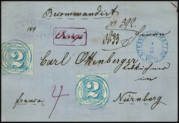 2 Sgr. blau per zwei auf dekorativem Chargé-Brief mit klaren blauen NS "71" und K1 "Steinbach-Hallbg." 1866 nach Nürnberg. Attest Helbig "vollständiger Durchstich und fehlerlos"