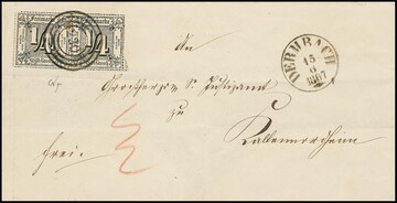 1/4 Sgr. schwarz, sehr seltenes Paar (oben zwei kleine Fleckchen) mit klarem NS "230" und K1 "Dermbach" auf Brief (dieser rs. Klappenteile etwas verkürzt und kleiner Randriß) nach Kaltennordheim. Paare dieser Marke auf Ganzstücken sind sehr selten! Attest Sem. Mi. 7500,-