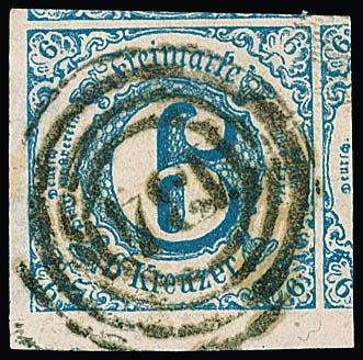 6 Kr. hellblau, enorm riesenrandige linke untere Bogenecke mit NS "134", alle möglichen Nebenmarken, etwas randhell, optisch ein Ausnahmestück!