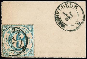 6 Kr. hellblau auf Prachtbriefstück mit seltener Fremdentwertung durch badischen K2 "Heidelberg", dieser ebenfalls nebengesetzt, Fotoexp. Sem