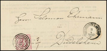 3 Kr. rosa, normal durchstochenes Prachtstück auf Postanweisung (übliche Mittelfalte) mit gutem NS "211" sehr zart, nebst K1 "Usingen", Feuser + 500,-
