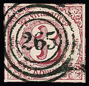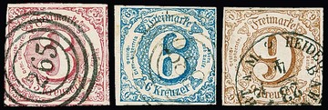 3 Kr. rot, enorm riesenrandiges Luxusstück mit zentrischem NS "265", alle vier Seiten Nebenmarken, sign. Bühler, Opitz, Kruschel. Dazu 6 Kr. hellblau (möglicherweise linke untere Bogenecke, NS "389", sign. Kruschel) und 9 Kr. ockerbraun (Bahnpost-K1) ebenfalls ungewöhnlich riesenrandig, schöne "Serie", ex Slg. Erivan Haub