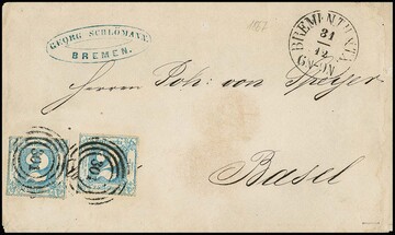 2 Sgr. blau, zwei Prachtstücke auf Silvester-Couvert (leichte Gebrauchsspuren) von Bremen nach Basel/Schweiz, sign. Pfenninger