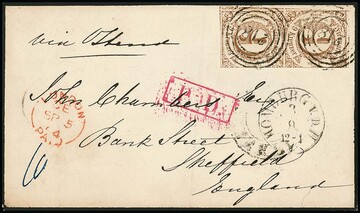 9 Kr. ockerbraun, dreiseitig vollrandiges Mischtypenpaar auf schwarz gerandetem Trauercouvert von Bad Homburg nach Sheffield/England, Fotoexp. Sem