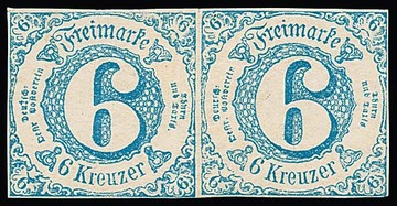 6 Kr. hellblau, ungebrauchtes waager. Luxuspaar in Mischtypen IA bzw. IB, selten