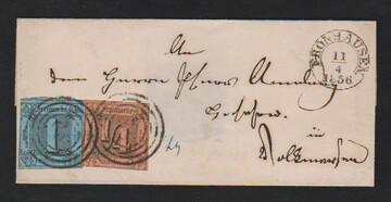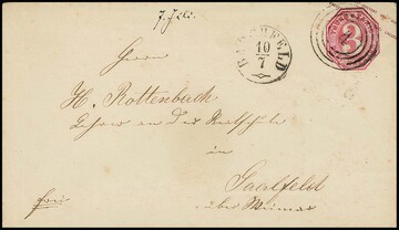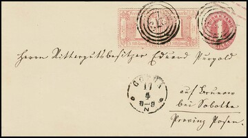 "4" nebst K1 "Barchfeld" klar auf Ganzsache 3 Kr. rosa (leichte Patina und rs. Siegel ausgeschnitten). Das bekannte Stück ex Reitmeister und aus der berühmten Kruschel-Auktion 1972. Nummernstempelbriefe von Barchfeld (wiedereröffnet 1.8.1861) sind ohnehin nicht häufig. Hier jedoch statt eines Silbergroschen-Couverts währungswidrig eine Kreuzer-Ganzsache verwendet, in vorliegender Form wohl Unikat. Sign. Haferkamp, Kruschel und Attest Sem