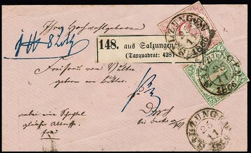 1 Kr. grün (kl. Mgl.) und etwas über den Rand geklebte 3 Kr. rosa auf entzückendem kleinem rosa Paketbegleitbrief (Damenformat) mit K2 "Salzungen" und Orts-Paketzettel 1866 nach Dippach im Landbezirk von Berka. Frankierte Paketbegleitbriefe waren erst ab dem 1.11.1866 möglich und sind von Taxis entsprechend selten (hier aus dem ersten Monat!)